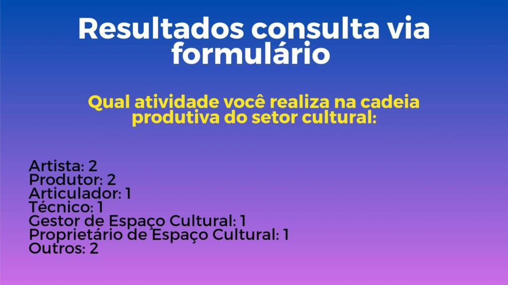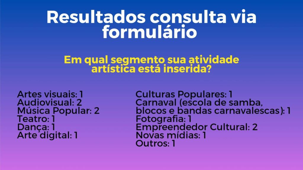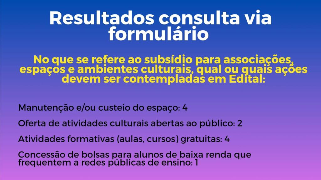 Com a participação ativa da comunidade artística presente, discutiram-se os resultados e demandas, culminando na formulação de um cenário ideal para a utilização dos recursos