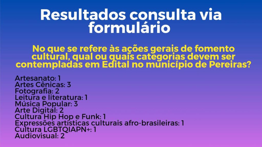 Os resultados obtidos através da Consulta Pública realizada via Google Forms para a aplicação da Política Nacional de Assistência à Cultura (PNAB) foram discutidos durante a Escuta Pública Presencial, realizada no dia 24/05 no Cine São Roque. Com a participação ativa da comunidade artística presente, discutiram-se os resultados e demandas, culminando na formulação de um cenário ideal para a utilização dos recursos. A distribuição destes recursos está detalhada no PAAR (Plano de Aplicação dos Recursos), disponível no Paço Municipal e aquino site da Prefeitura Municipal, na aba cidadão – Aldir Blanc.