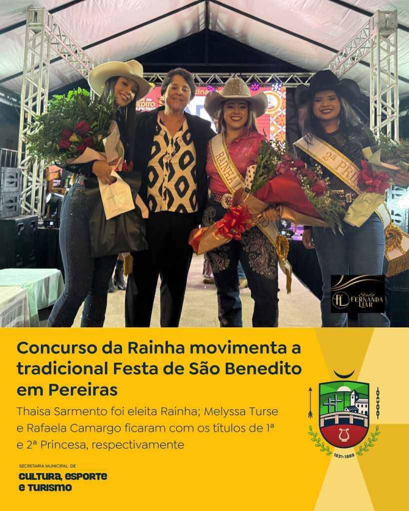 A grande vencedora da noite foi Thaisa Sarmento, coroada Rainha de Pereiras 2025. O título de 1ª Princesa ficou com Melyssa Turse, enquanto Rafaela Camargo foi escolhida como 2ª Princesa.