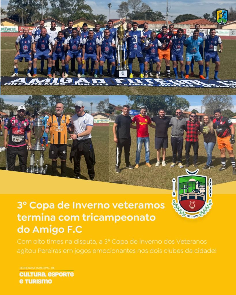 A Copa de Inverno dos Veteranos chegou à sua terceira edição em grande estilo, reunindo oito equipes e movimentando o esporte em Pereiras. O campeonato teve início em maio, com jogos realizados nos dois clubes da cidade, promovendo integração, lazer e grandes partidas.