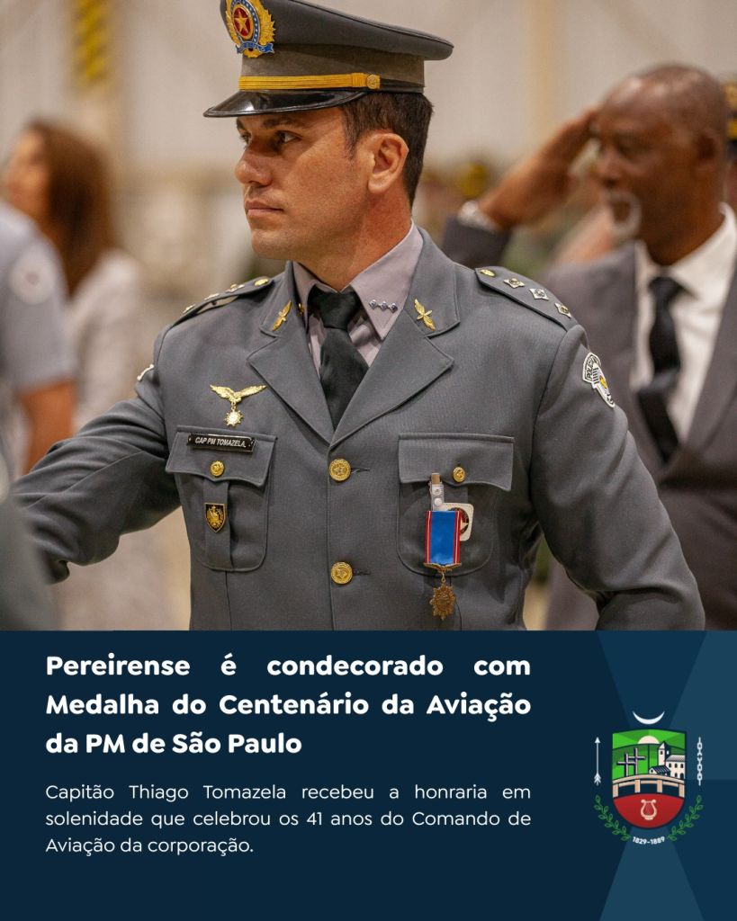 O Capitão da Polícia Militar Thiago José Tomazela, filho de Pereiras, foi condecorado com a Medalha do Centenário da Aviação da PM de São Paulo. A solenidade aconteceu no Hangar João Negrão, em São Paulo, e reuniu autoridades civis e militares.